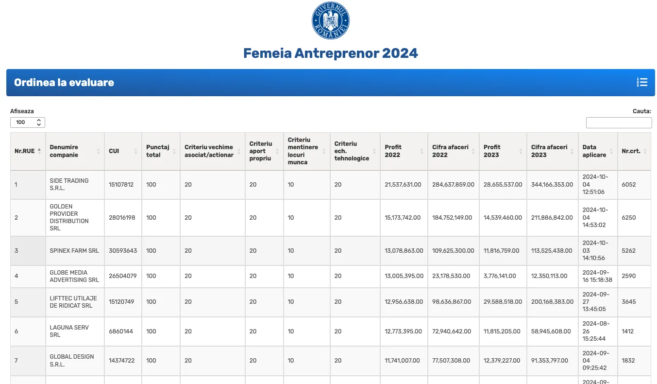 Conform procedurii aprobate pentru programul „Femeia Antreprenor”, Ministerul Economiei, Antreprenoriatului și Turismului publică lista în ordinea RUE a aplicantelor înscrise în cadrul sesiunii 2024 a programului național multianual pentru dezvoltarea culturii antreprenoriale în rândul femeilor manager din sectorul IMM.