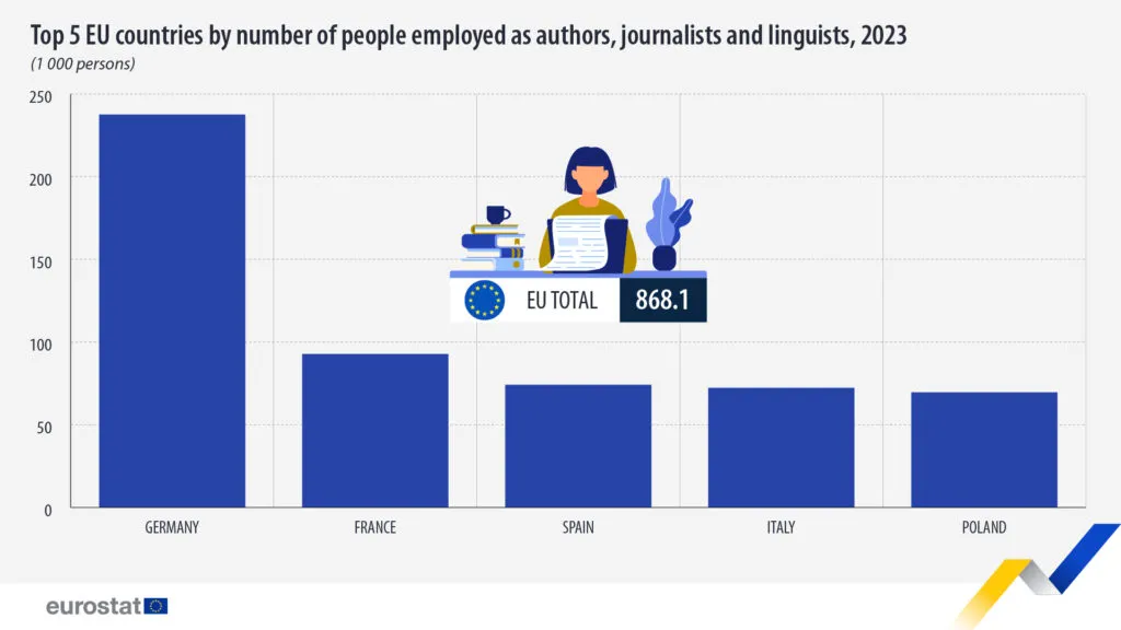 În 2023, 868.700 de persoane din Uniunea Europeană erau angajate ca autori, jurnaliști sau lingviști. Numărul acestora a scăzut cu 2,5% față de 2022.