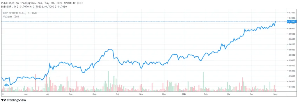 În ședința de tranzacționare de joi a Bursei de la București, acțiunile OMV Petrom (simbol bursier SNP) au înregistrat un plus de (2,5%). Cotațiile companiei au crescut la 0,7075 lei pe acțiune, de asemenea cel mai ridicat nivel.