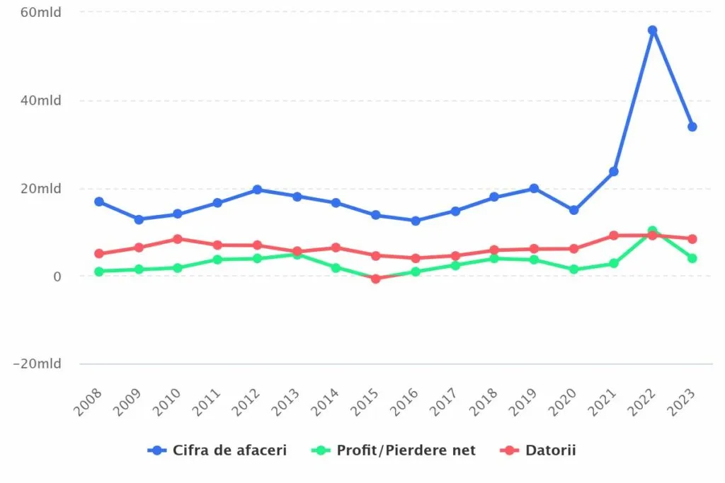 Compania OMV Petrom SA din București a raportat pe anul trecut o cifră de afaceri de 33,8 miliarde de lei. Este o scădere a veniturilor cu 40% față de anul precedent. Asta după ce în anul precedent, în 2022, cifra de afaceri a fost de 55,9 de miliarde de lei. Scăderea a fost de 22 de miliarde de lei sau de 4,4 miliarde de euro.