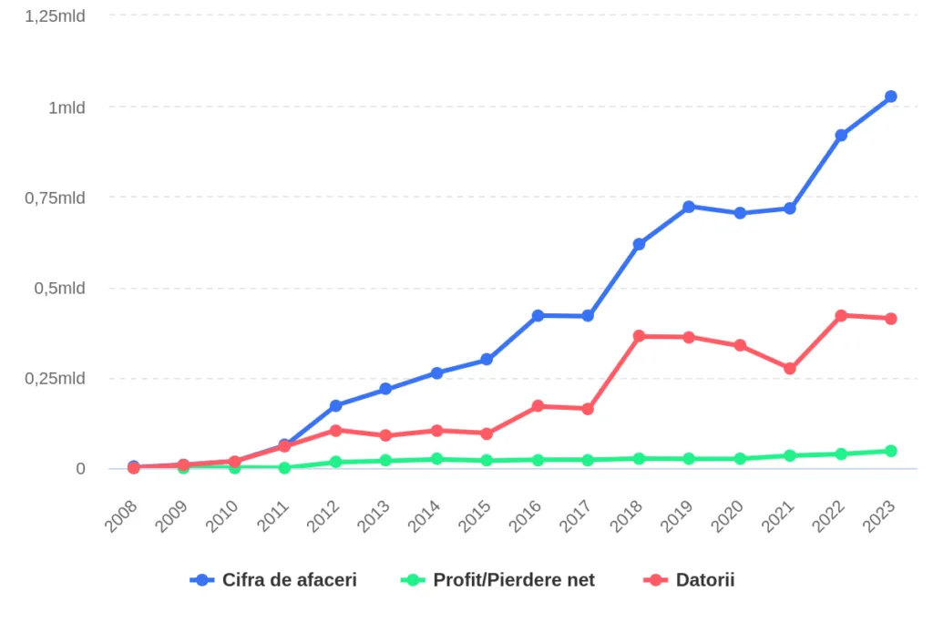 Catena Hygeia SRL din Pitești, județul Argeș, a raportat pe anul trecut o cifră de afaceri de 1.025 miliarde de lei. Asta după ce în anul precedent, în 2022, cifra de afaceri a fost de aproape 920 de milioane de lei. S-a înregistrat astfel o cifră de afaceri cu aproape 105 de milioane de lei în plus în 2023 față de anul precedent. Procentual, creșterea a fost de 11%.