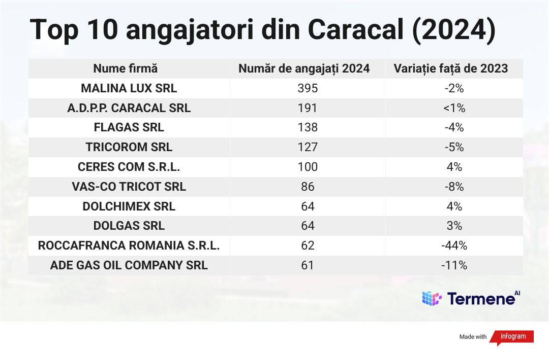 În topul angajatorilor din Caracal mai găsim nume precum Administrarea Domeniului Public și Privat, adică ADPP Caracal (RO32692511), benzinarul Flagas (RO10066630), companiile textile Tricorom (RO11605601), Vas-Co Tricot (RO23621074) și Roccaafranca România (RO11706908) sau retailerul Ceres Com (RO8312466), care operează Ana Maria Market.