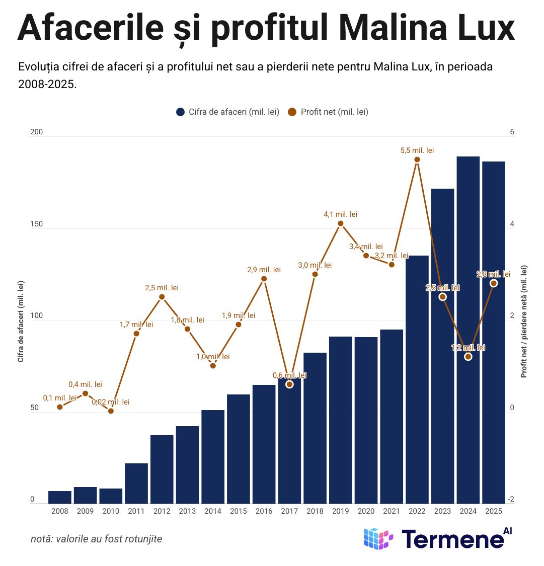 - Malina Lux a avut o cifră de afaceri de 186,2 mil. lei în 2025, în scădere cu aproximativ 2% față de anul 2024, marcând prima scădere a cifrei de afaceri din ultimii șase ani.