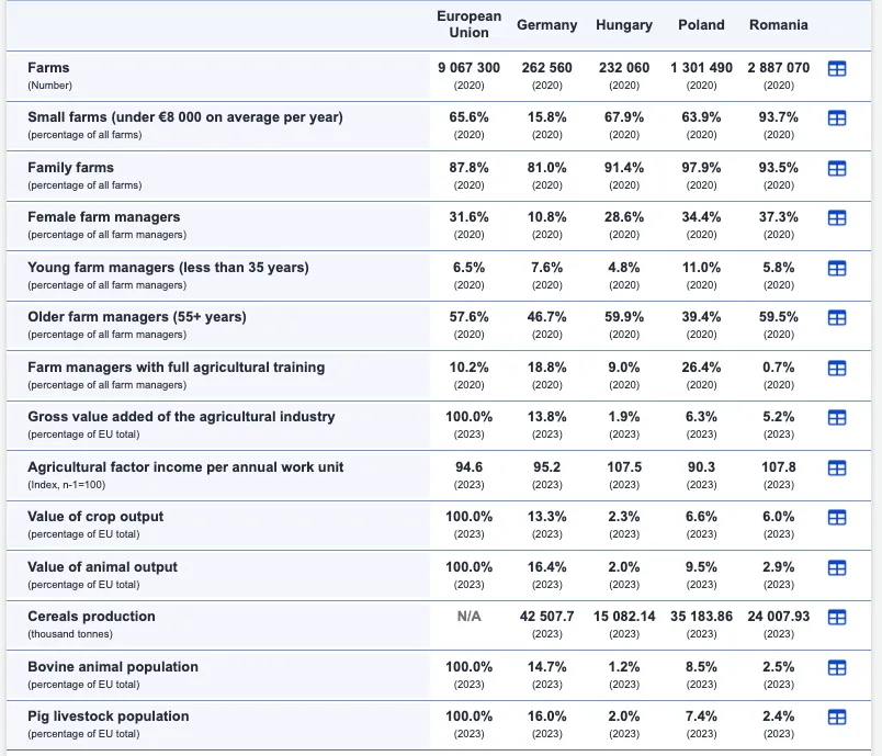 În Uniunea Europeană, agricultura joacă un rol esențial, cu un total de 9.067.300 de ferme înregistrate în 2020. Dintre acestea, Germania are 262.560 de ferme, Ungaria 232.060, Polonia 1.301.490, iar România 2.887.070.
