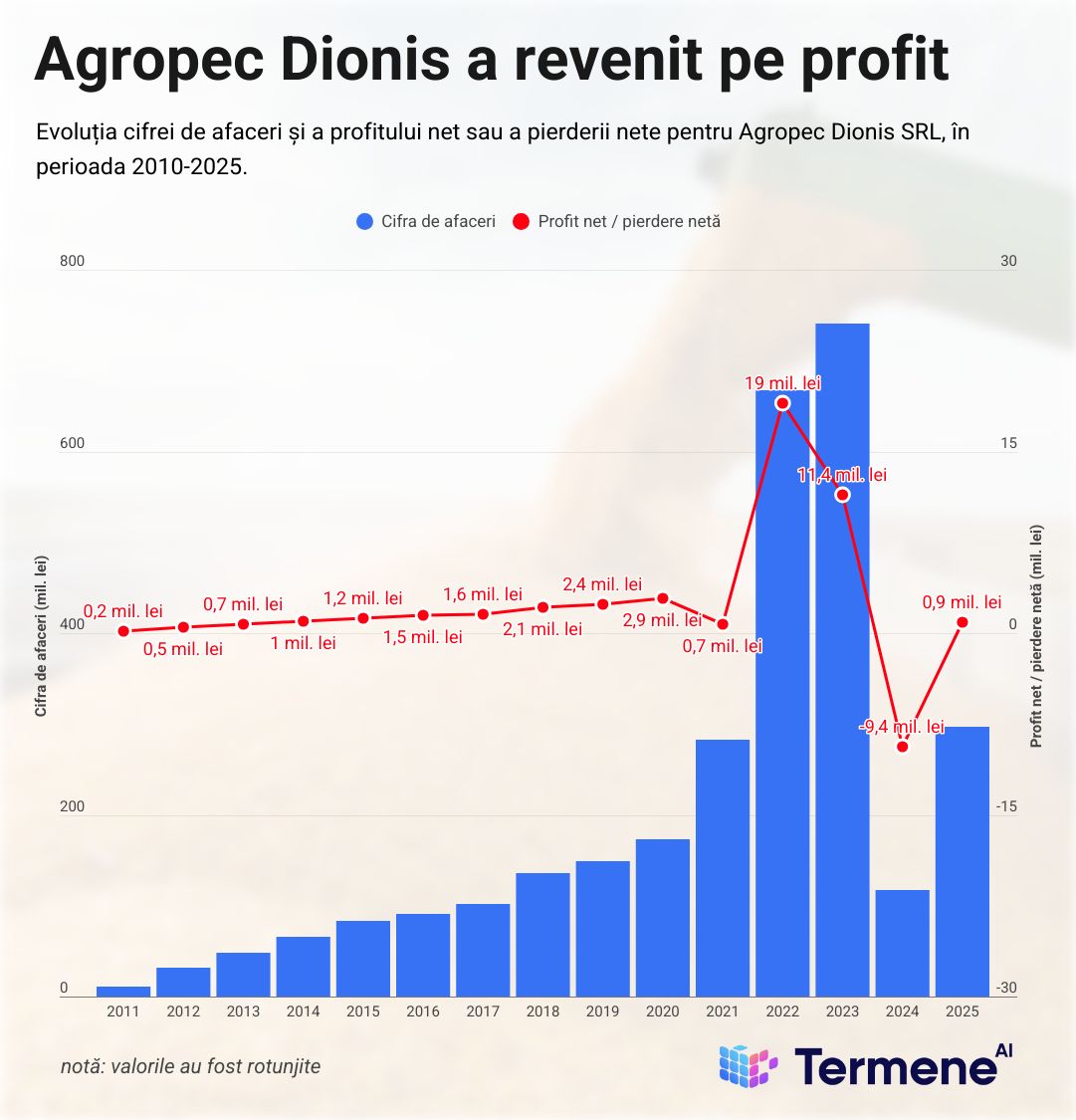 Mai exact, Agropec Dionis (RO26130560) a avut un profit net de 859.600 de lei în 2025, comparativ cu o pierdere netă de 9,4 mil. lei în 2024. Totuși, profitabilitatea din 2025 este comparabilă cu cea din anul 2021.