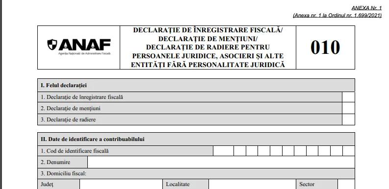 Formularul utilizat pentru "Declarație de înregistrare fiscală/Declarație de mențiuni/Declarație de radiere pentru persoanele juridice, asocieri și alte entități fără personalitate juridică" a fost actualizat pentru a include noile obligații fiscale.