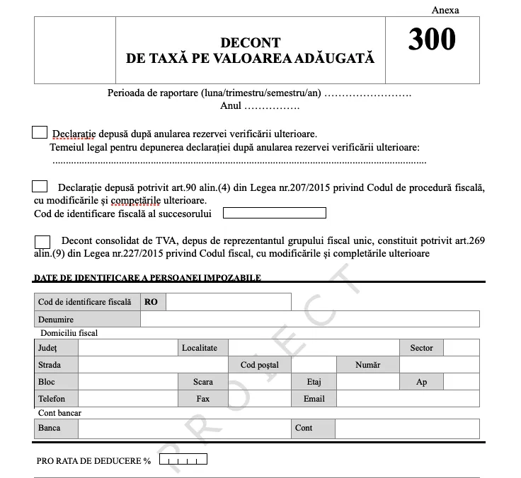 Direcția generală de legislație fiscală și reglementări vamale și contabile din cadrul Ministerului Finanțelor, prin adresa nr.739684/20 martie 2024, a solicitat eliminarea din formularul (300) "Decont de taxă pe valoarea adăugată" a următoarelor rânduri: