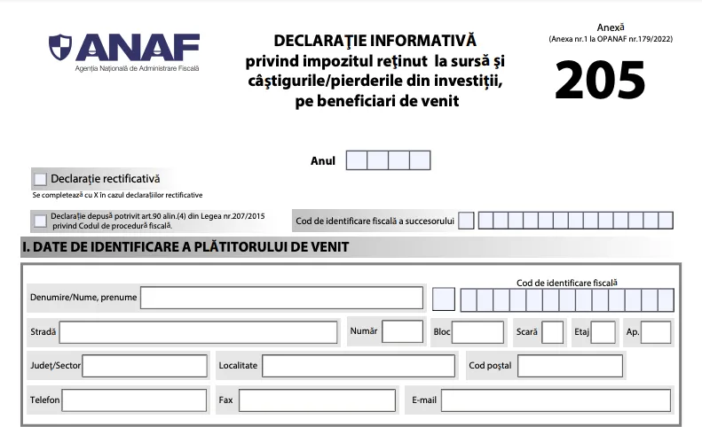 Formularul 205 „Declarație informativă privind impozitul reţinut la sursă şi câştigurile/pierderile din investiții, pe beneficiari de venit" şi Formularul 207 „Declaraţie informativă privind impozitul reținut la sursă/impozitul suportat de plătitorul de venit/veniturile scutite, pe beneficiari de venit nerezidenţi” vor fi modificate de Fisc. Instituția a pus în dezbatere publică un proiect de Ordin al Președintelui Agenției Naţionale de Administrare Fiscală (OPANAF) prin care se vor schimba Formularul 205 (sau Declarația 205) și Formularul 207 (Declarația 207).