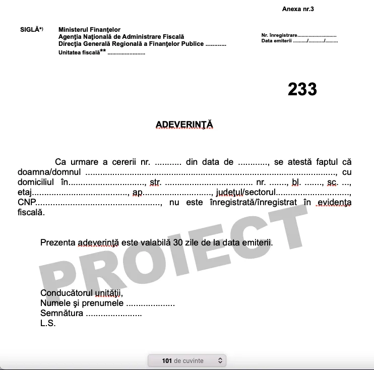- Formularul 233 - „Adeverință”, formular care atestă că persoana fizică nu figurează înregistrată în evidența fiscală.