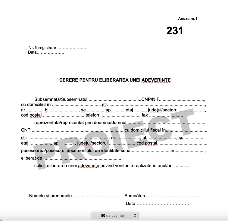- Formularul 231 - „Cerere pentru eliberarea unei adeverințe”, formular care va fi utilizat de persoanele fizice care solicită eliberarea unei adeverințe/adeverințe de venit.