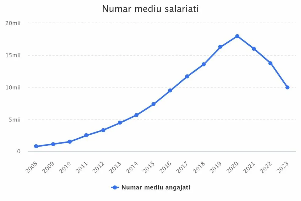 Anul trecut, numărul mediu al angajaților a fost de 9.944, un număr cu 28% mai mic față de cel din 2022, când erau 13.714 angajați. În 2020, Profi Food Rom SRL avea aproape 20.000 de angajați.