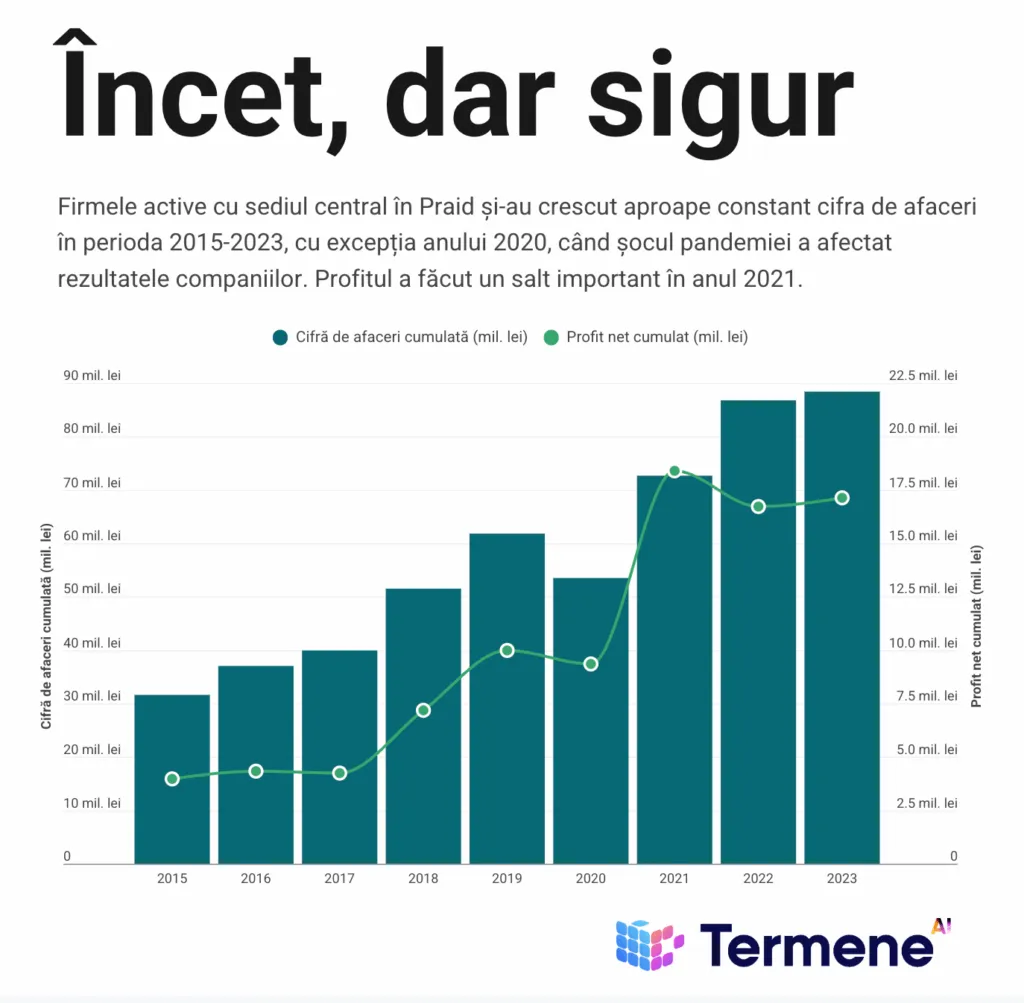 Doar 88 de companii active sunt înregistrate în comuna Praid, conform Termene Pasp, cu o cifră de afaceri netă cumulată de 88,4 mil. lei în 2023, pe cele mai recente date complete disponibile. Unele companii au depus deja bilanțul pentru anul 2024, însă acestea nu oferă o imagine fidelă a unei localități sau a unui sector cât timp sunt incomplete.