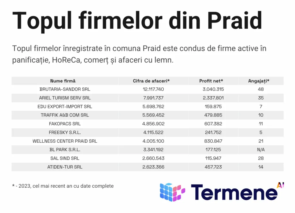În total, cifra de afaceri cumulată a firmelor din Praid a înregistrat o creștere de aproape 180% în perioada analizată. Primii cinci agenți economici din topul firmelor din Praid reprezintă peste 40% din cifra de afaceri cumulată a tuturor companiilor active înregistrate în comună la nivelul anului 2023.