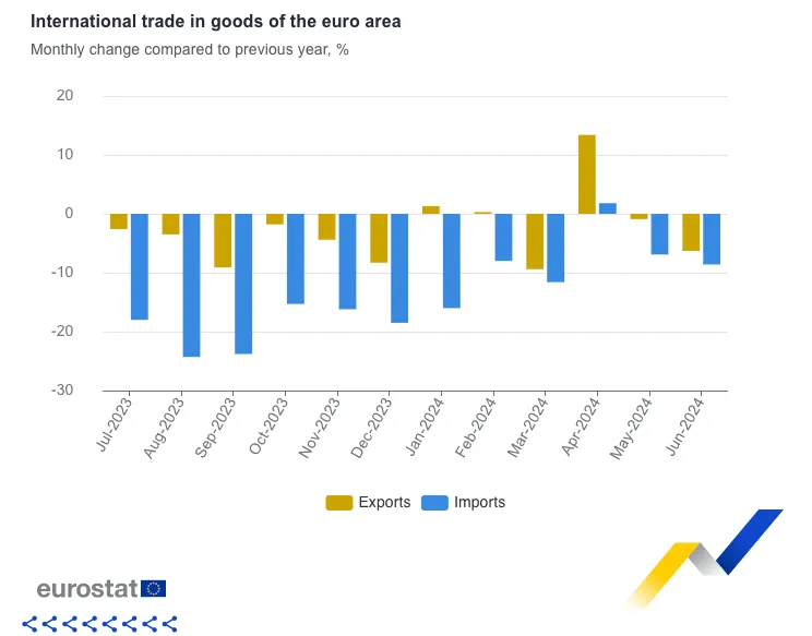 Pe parcursul primelor șase luni ale anului 2024, zona euro a înregistrat un excedent total de 107,5 miliarde de euro, o schimbare semnificativă față de deficitul de 3,0 miliarde de euro din aceeași perioadă a anului precedent. Exporturile din zona euro au scăzut ușor, cu 0,8%, totalizând 1 430,1 miliarde de euro, în timp ce importurile au scăzut cu 8,4%, la 1 322,6 miliarde EUR.