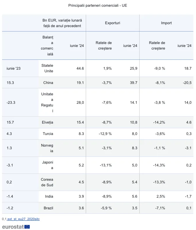 Exporturile din UE au scăzut cu 6,1%, ajungând la 212,3 miliarde de euro, iar importurile au scăzut cu 7,7%, totalizând 191,4 miliarde de euro.