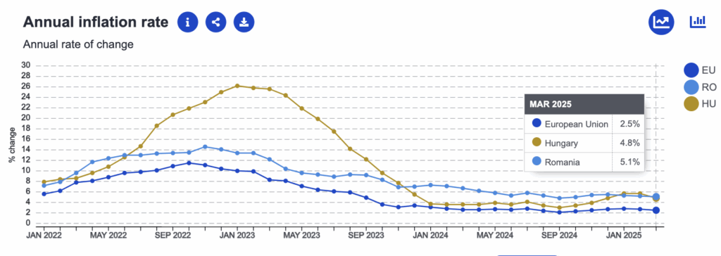 Ungaria a înregistrat o creștere a inflației de 4,8% în luna martie 2025 raportat la luna martie din 2024. În România, inflația a fost de 5,1%.