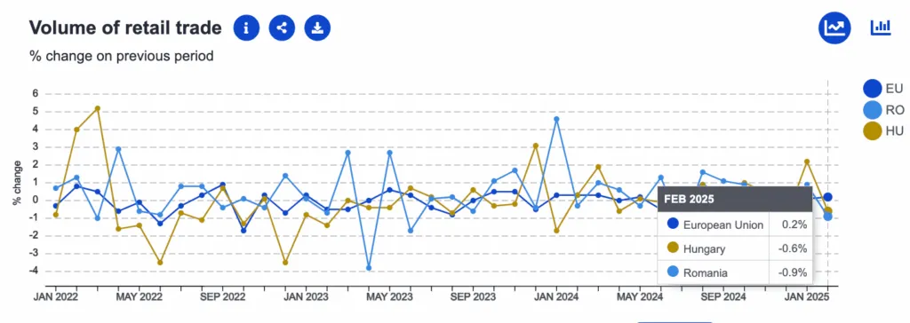 România a înregistrat, în luna februarie 2025, o scădere a comerțului cu amănuntul de 0,9% față de ianuarie 2025. Ungaria a înregistrat însă o scădere de 0,6%.