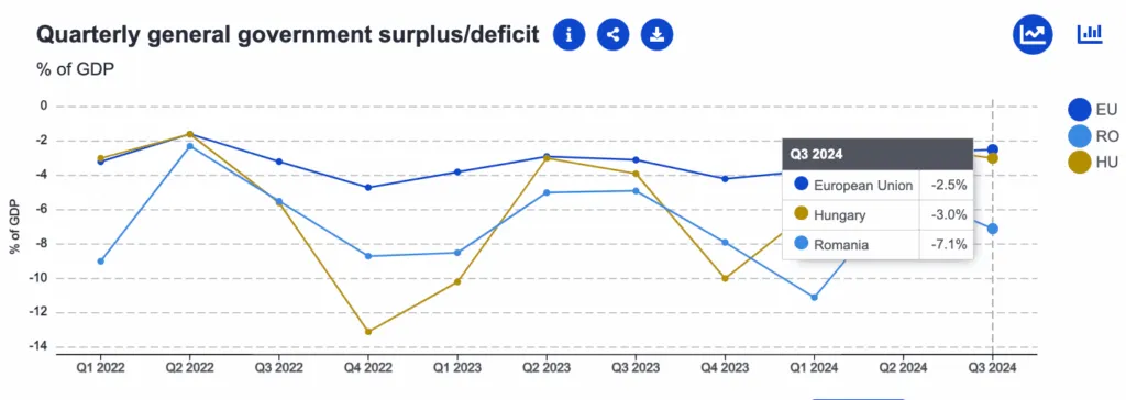 Deficitul din trimestrul III din 2024 a fost de 7,1% în România. În Ungaria, deficitul trimestrial a fost de 3%.