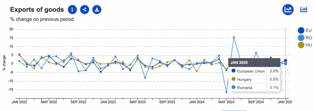 Ungaria a exportat ai mult în ianuarie 2025, ca și creștere procentuală față de decembrie 2024 cu 0,5%. România a avut un plus de doar 0,1%.