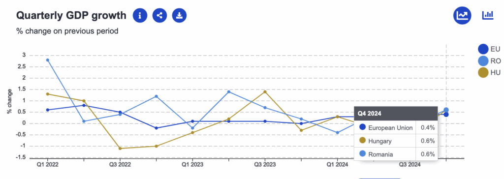 Țara noastră a avut o creștere a PIB-ului propriu de 0,6%%. În Ungaria, creșterea PIB-ului a fost tot de 0,6% în trimestrul al patrulea din 2024.