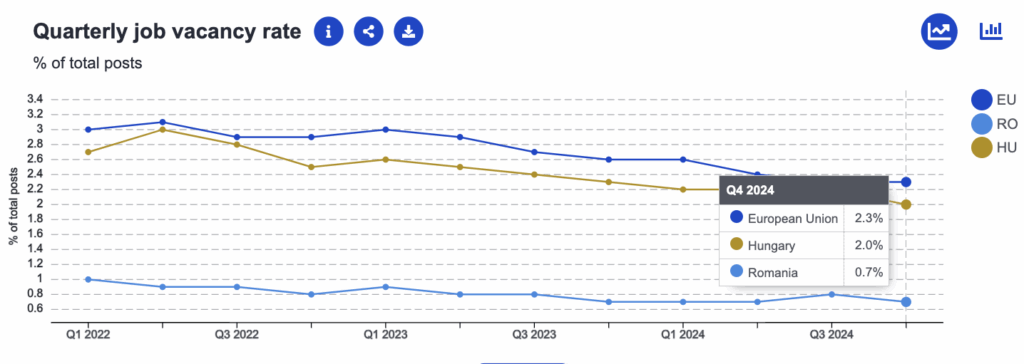 Doar 0,7% din locurile de muncă oferite de angajatori nu își găsesc solicitanți în România. Procentul în Ungaria este mai mare, de 2%.