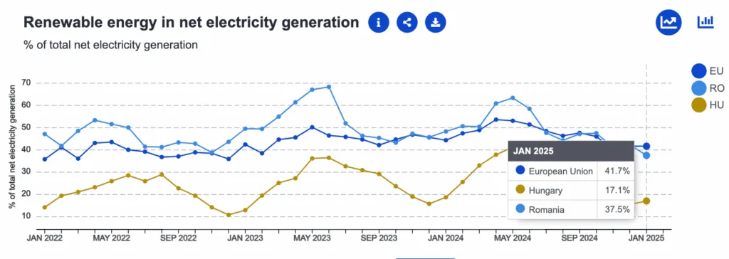 România a avut, în ianuarie 2025, 37,5% din energia produsă din surse verzi. În Ungaria procentul a fost de 17,1% puncte procentuale.
