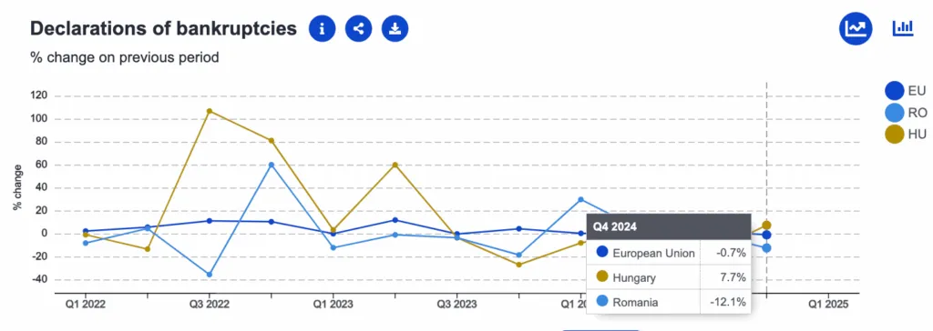 Ungaria a înregistrat, în ultimul trimestru din 2024 față de ultimul trimestru din 2024, o creștere a falimentelor cu 7,7%. România a înregistrat chiar o scădere de 12,1%.