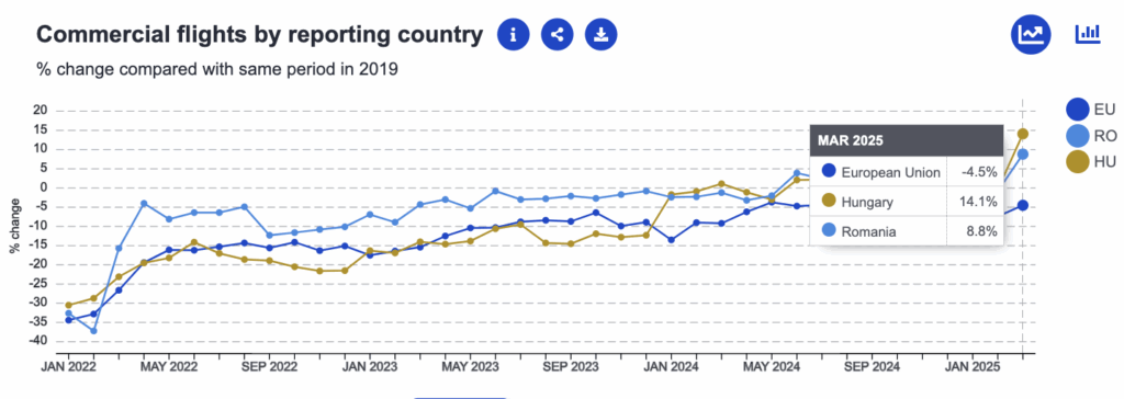 Ungaria a înregistrat, în luna martie 2025, o creștere numărului zborurilor comerciale cu 14,1% față de luna martie din 2019. România a înregistrat o creștere cu 8,8%.