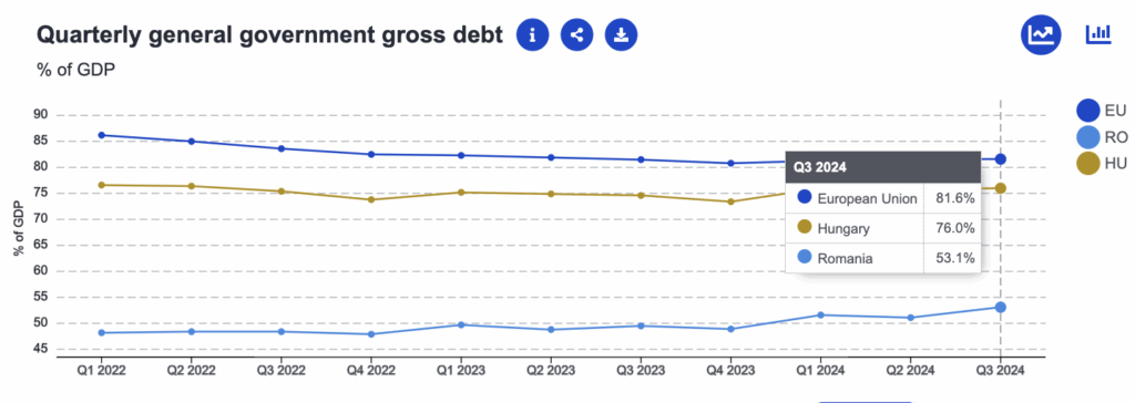 Datoria publică a Ungariei este de 76% din PIB în trimestrul al treilea din 2024. În schimb, România are o datorie de 53,1% din PIB.