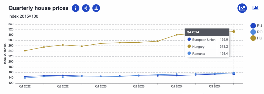 Ungaria a înregistrat o creștere a prețului locuințelor (raportat la 2015) mai mare față de cea din România. În România, în trimestrul al patrulea din 2024, prețul caselor era mai mare cu 158,4% față de 2015. În Ungaria, creșterea era de 313,2%.