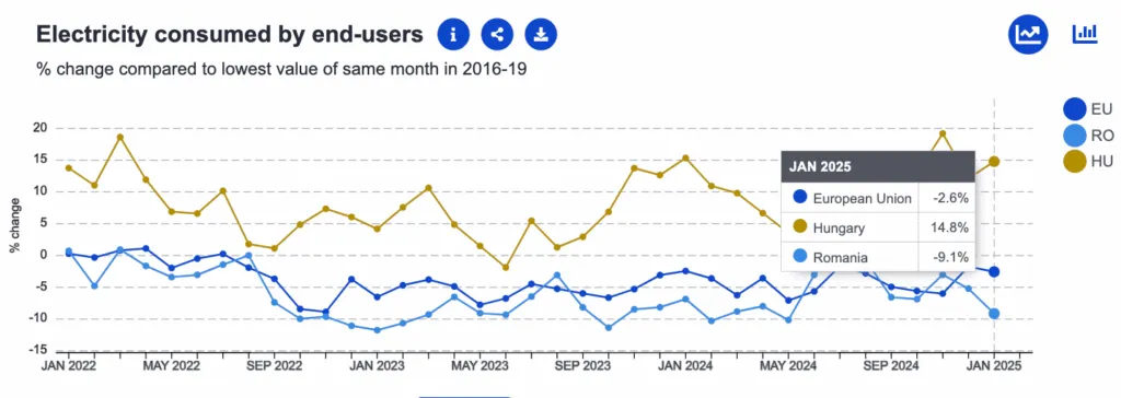 Astfel, România a înregistrat o scădere a consumului de energie cu 9,1% în decembrie 2024 față de perioada 2016-2019. Ungaria a înregistrat o creștere a consumului de energie cu 14,8%. Diferența de consum am pus-o pe baza scăderii producției industriale din România.