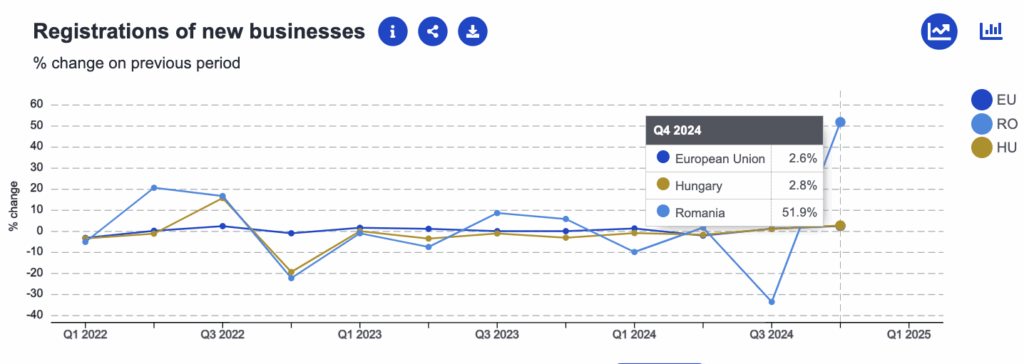 România a avut, în trimestrul al patrulea din 2024, o creștere a numărului firmelor înregistrate cu 51,9% față de trimestrul al patrulea din 2023. În schimb, Ungaria a avut o creștere de doar 2,8%.