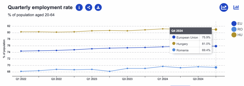 România are o rată a șomajului cu 5,6% în luna februarie din 2025 în rândul populației între 15 și 74 de ani. Rata din Ungaria este de doar 4,3%.