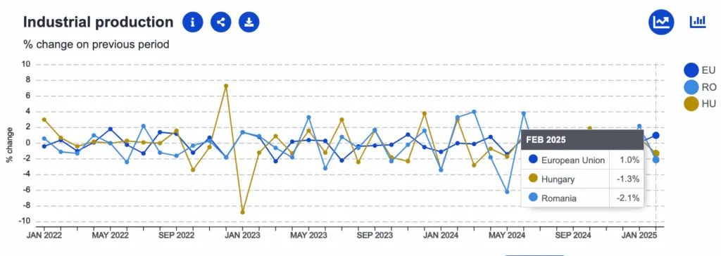 Ungaria a înregistrat o scădere de 1,3%. România a înregistrat tot scădere a producției industriale de 2,1% în luna februarie 2025 raportat la luna ianuarie din 2025. Media UE a fost de plus 1%.