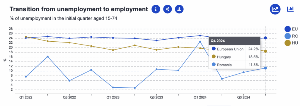 Țara noastră a avut o rata de angajare a șomerilor în trimestrul al patrulea din 2024 de 11,3% față de începutul anului. Ungaria a înregistrat o rată de angajare a celor fără loc de muncă de 18,5%.