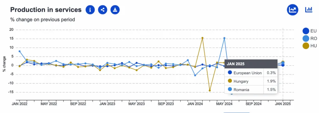 Ungaria a înregistrat, în luna ianuarie 2025, o creștere de 1,5% față de luna decembrie 2024. România a avut o creștere de 1,9%.