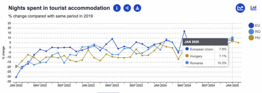 Ungaria a înregistrat o creștere a nopților de cazare de 7,31 în luna ianuarie 2025 raportată cu luna ianuarie din 2019. România a avut o creștere de 10,3%.