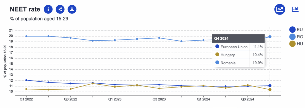 România are o rata a tinerilor (19,9%) cu vârsta între 15 și 29 de ani (care nu muncesc, nici nu studiază) mai mare decât cea dinUngaria (10,4%).