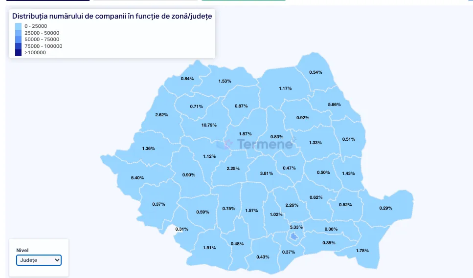 Mehedinți (236), Tulcea (220), Călrași (270), Ialomița (274) și Caraș-Severin (287) sunt județe care înregistrează numărul cel mai mic de firme.