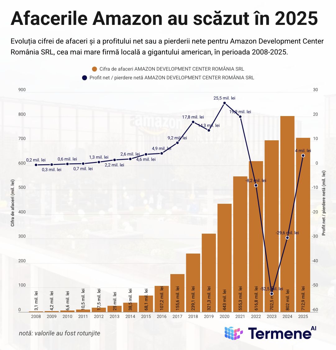 Mai exact, Amazon Development Center România SRL (RO17810435) a înregistrat o cifră de afaceri de 712,9 mil. lei în 2025, în scădere cu 11% față de anul 2024, ceea ce a adus compania la un volum apropiat de cel din 2023.