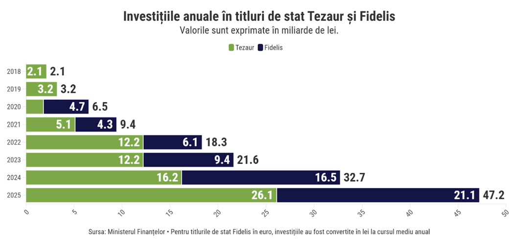 Lucrurile stau însă diferit când vine vorba despre titlurile de stat denominate în euro, care sunt disponibile exclusiv în cadrul programului Fidelis și care au cumulat investiții de peste 6,6 miliarde de euro în perioada 2020-2025.