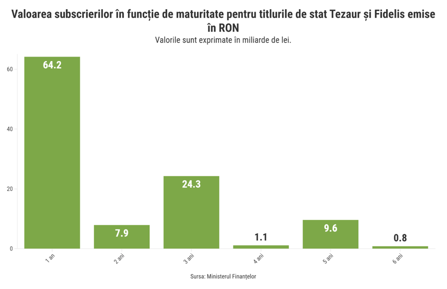 Astfel, putem spune că tradiționala aversiune la risc a populației s-a resimțit inclusiv în cazul titlurilor de stat, însă ponderea ridicată este și rezultatul strategiei adoptate de stat: maturitatea de un an a fost oferită la toate emisiunile Tezaur și Fidelis desfășurate din martie 2019 până în mai 2025.
