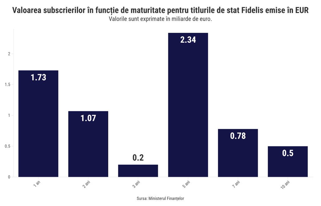 În acest caz, maturitatea preferată de investitori a fost de 5 ani, cu o pondere de 35,3%, în timp ce maturitatea de un an a atras 26,1% dintre sumele alocate. De asemenea, maturitatea de 2 ani a atras 16,1% dintre sumele alocate, în condițiile în care aceasta a devenit maturitatea minimă pentru emisiunile denominate în euro începând din decembrie 2024. Tot de atunci a fost disponibilă în premieră și maturitatea de 7 ani, care a atras însă 11,6% din totalul fondurilor.