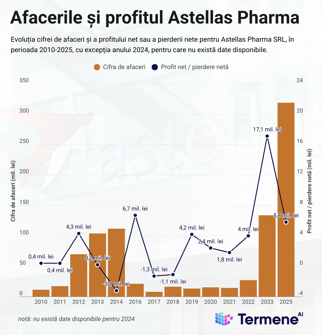 Mai exact, compania Astellas Pharma SRL (RO25886345) a avut o cifră de afaceri de 318,9 mil. lei în 2025, dar nu putem face o comparație cu anul anterior, întrucât bilanțul companiei pentru anul 2024 nu este disponibil în datele publice.