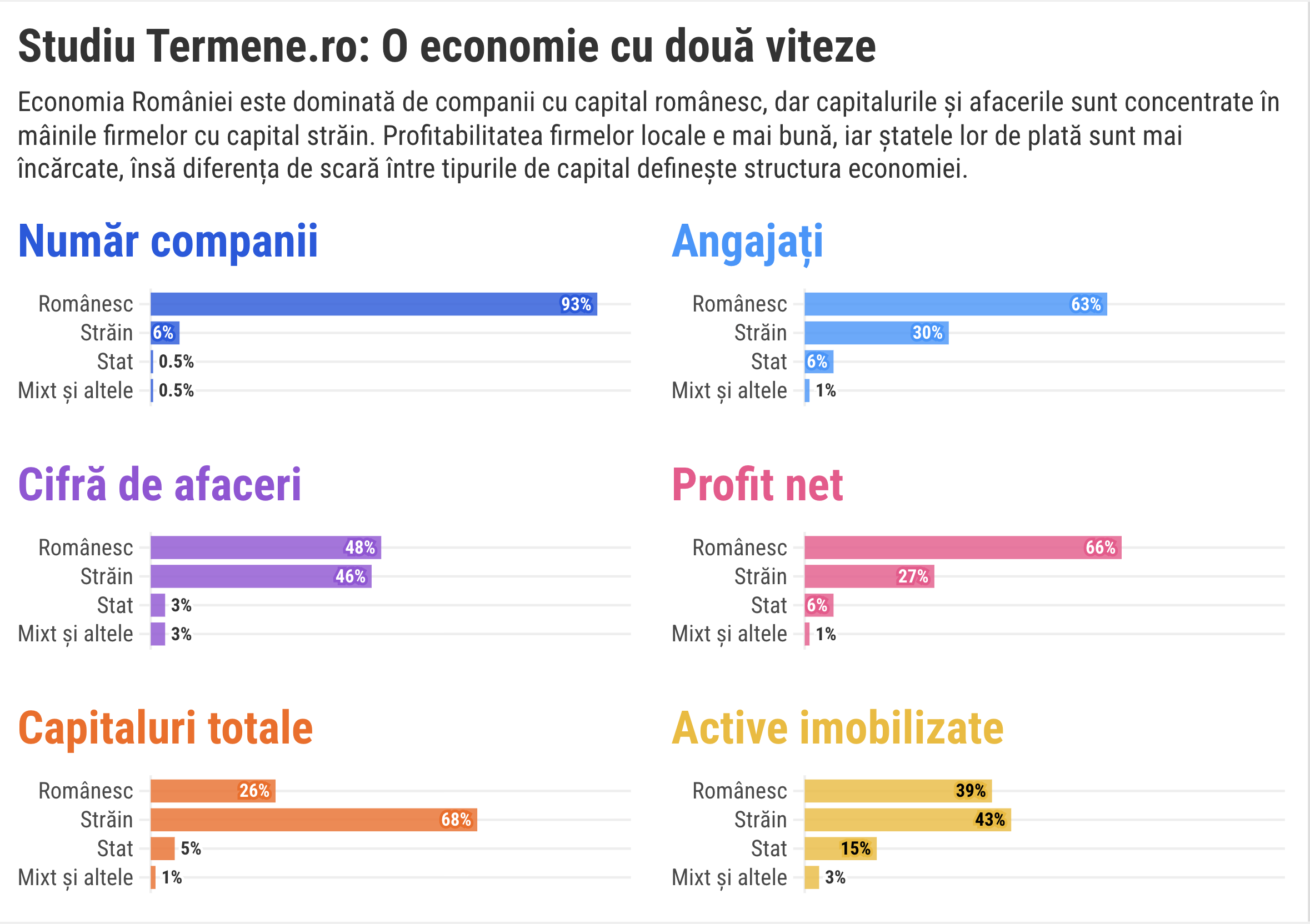 România, economia cu două viteze: 94% dintre firme sunt românești, dar capitalul și marile afacerile sunt controlate de companii străine. Aceasta a fost concluzia principală a studiului O economie cu două viteze, prin care am analizat cine stă cu adevărat în spatele celor 840.000 de companii care au depus bilanț pentru anul 2024.