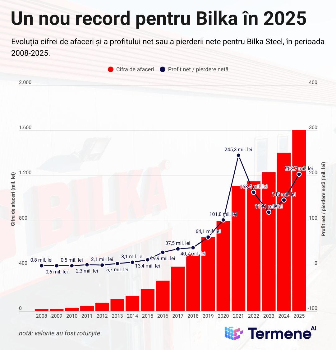 Mai exact, compania Bilka Steel SRL (RO21520278) a înregistrat o cifră de afaceri de 1,6 mld. lei în 2025, în creștere cu mai mult de 14% față de anul anterior. Astfel, compania își continuă tendința de creștere continuă.