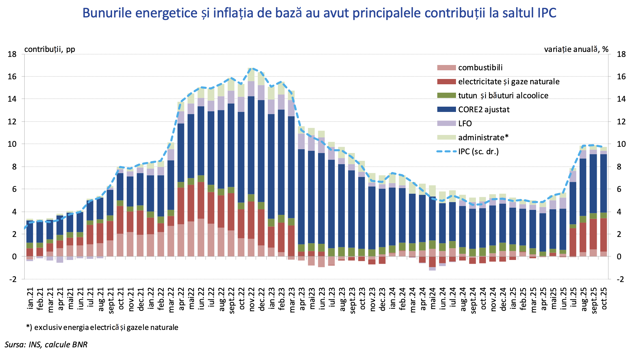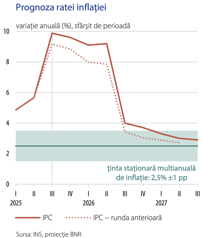 „Niveluri ridicate ale inflației vor persista până la jumătatea anului viitor, urmând ca, odată cu ieşirea din baza de raportare a şocurilor recente, rata anuală să se reducă semnificativ – cu aproximativ 5 puncte procentuale în trimestrul III 2026.