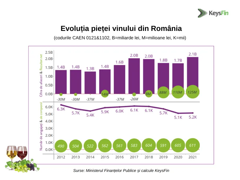 Tot atunci, piața vinului românesc a produs afaceri între 1 și 1,5 miliarde de lei, în funcție de modul de calcul al afacerilor companiilor din domeniu. Astfel, cei mai mari producători, în funcție de cifrele de afaceri raportate la Ministerul Finanțelor au fost: Cramele Recaș, din județul Timiș, a raportat o cifră de afaceri de 200 de milioane de lei. Acționari principali sunt: Gheorghe Mihai Iova (30%), Ioan Georgiu (30%) și soții Philip Andrew Cox și Elvira Cox (30%). Vinuri mai cunoscute ale companiei: Cramele Recaș, Recaș, Recaș Cabernet Sauvignon, Recal Sauvignon Blanc. Jidvei, din județul Alba, a raportat afaceri de 144 de milioane de lei Acționarul majoritar este Claudiu Necșulescu. Mărcile mai importante ale companiei: Vinul Cetății, Jidvei Tradițional, Vinul Viu. Cotnari, din județul Iași, afaceri de aproape 120 de milioane de lei prin cele două firme din grup care se ocupă de vin. Cele două firme din grup care se ocupă de vinuri au ca acționari la: Casa de Vinuri Cotnari SA, pe: Remus Ionuț Deleanu (22%), Victor Ioan Deleanu (22%), Neculai Carja (22%), Ștefan Matei (10%), Theodor Matei (10%) și Ioan Maluțan (10%); Cotnari Vin SA, pe Ala Procopenco (45%) și Radu Iepuraș (54%, prin intermediul Alpro United Recovery) Vinuri mai cunoscute: Cotnari, Colocviu, Simpozion.