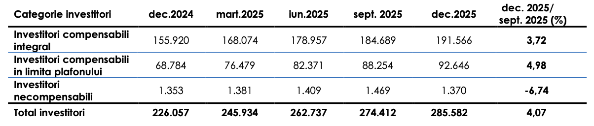 Categoria investitorilor eligibili pentru compensare, cu portofolii mai mici decât plafonul de 20.000 de euro, este cea mai numeroasă categorie de investitori, înregistrând la sfârșitul trimestrului IV al anului 2025 o creștere de 3,72%, atingând astfel un număr de 191.566 de investitori.