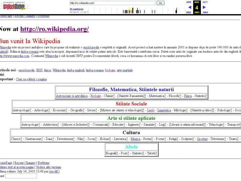 19 iunie 2003 - A fost lansată versiunea localizată a Wikipedia în limba română, contribuind la accesul larg la informație și la educația publicului românesc.